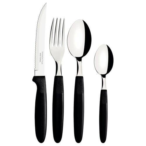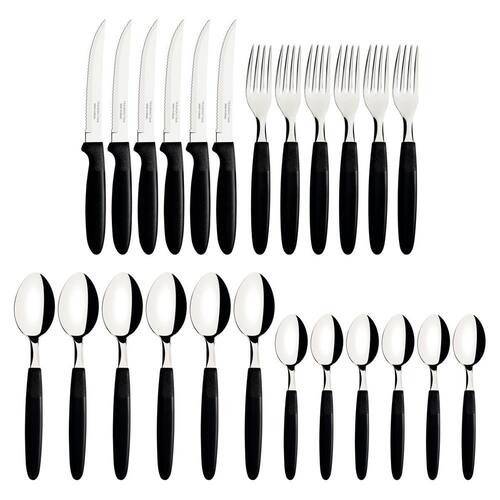 Set Tramontina Ipanema 25 pz con cubiertero. Cubiertos de acero inoxidable y mangos negros resistentes. Ideal para uso diario. Cómpralo en Ferniplast.com.