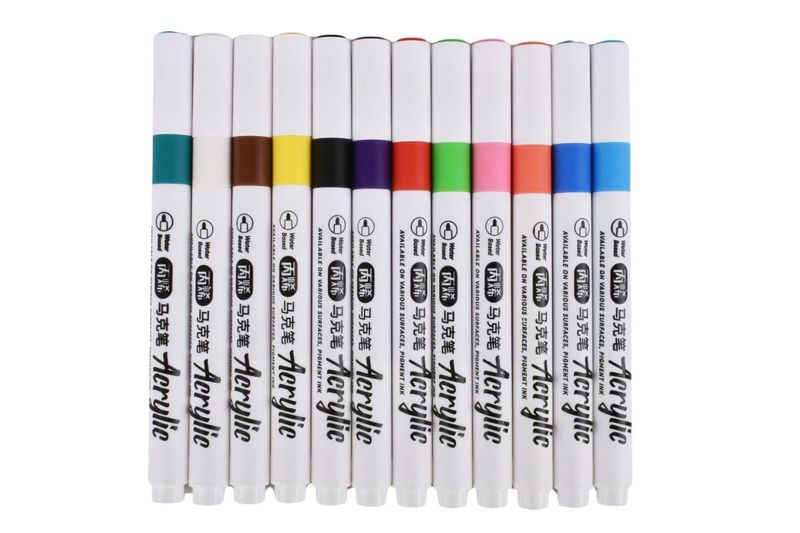 Set de 12 marcadores acrílicos de colores vibrantes, ideales para crear en múltiples superficies con trazo firme y duradero. Perfectos para proyectos de arte, lettering, manualidades escolares, decoración de objetos y trabajos creativos en distintas superficies.