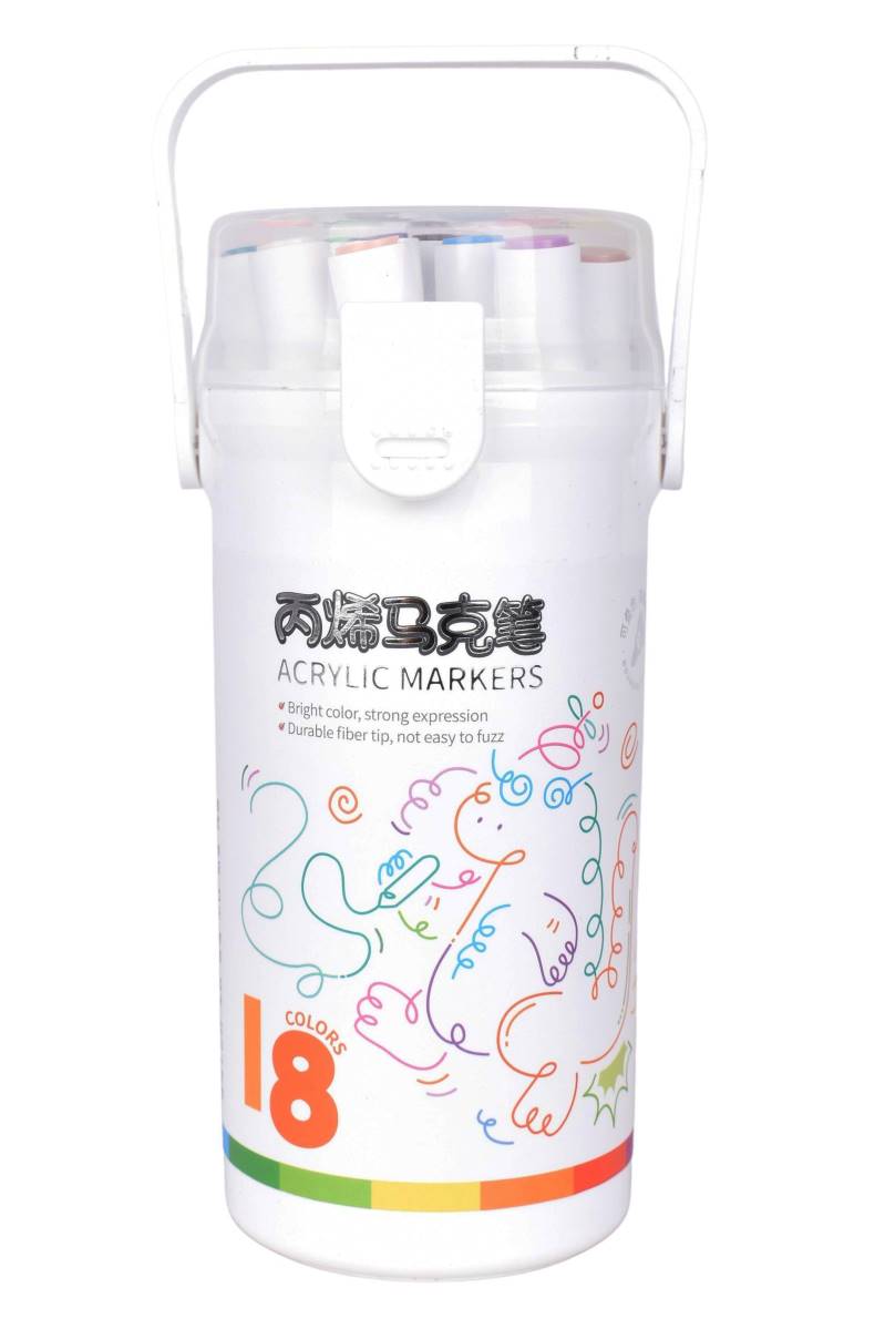Set de 18 marcadores acrílicos en colores vibrantes dentro de un práctico tubo plástico portátil, ideal para dibujar y pintar en cualquier lugar. Perfectos para ilustraciones, rotulación creativa, proyectos escolares y actividades artísticas. Su envase portátil facilita llevarlos a clases, talleres o viajes.
