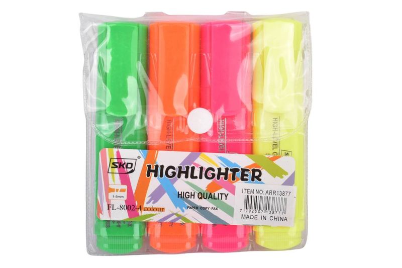 Resaltadores flúo en estuche x4, ideales para estudio y oficina. Colores intensos y punta versátil. Cómpralos en Ferniplast.com