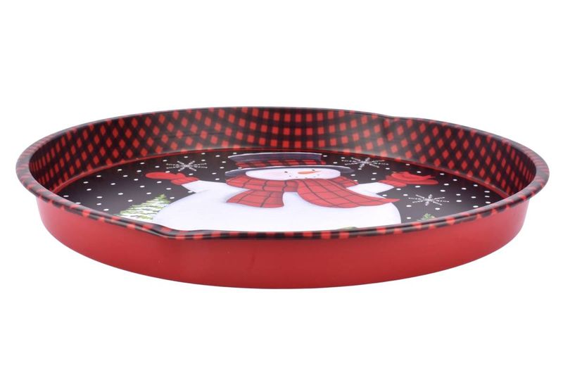 Bandeja navideña metálica redonda 30 cm con diseño de muñeco de nieve. Ideal para decorar o servir dulces. ¡Viví la Navidad con Ferniplast.com!