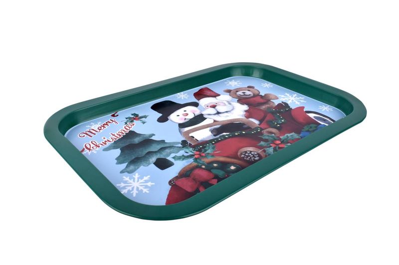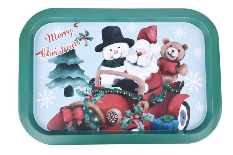 Bandeja decorativa navideña con diseño de Papá Noel y muñeco de nieve. Ideal para servir dulces o decorar la mesa en las fiestas. Perfecta para presentar galletas, pan dulce o snacks en celebraciones navideñas. También se usa como bandeja decorativa para centros de mesa o regalos temáticos.