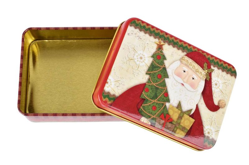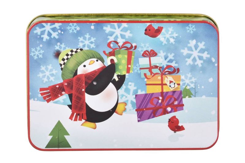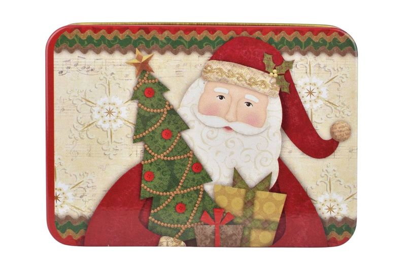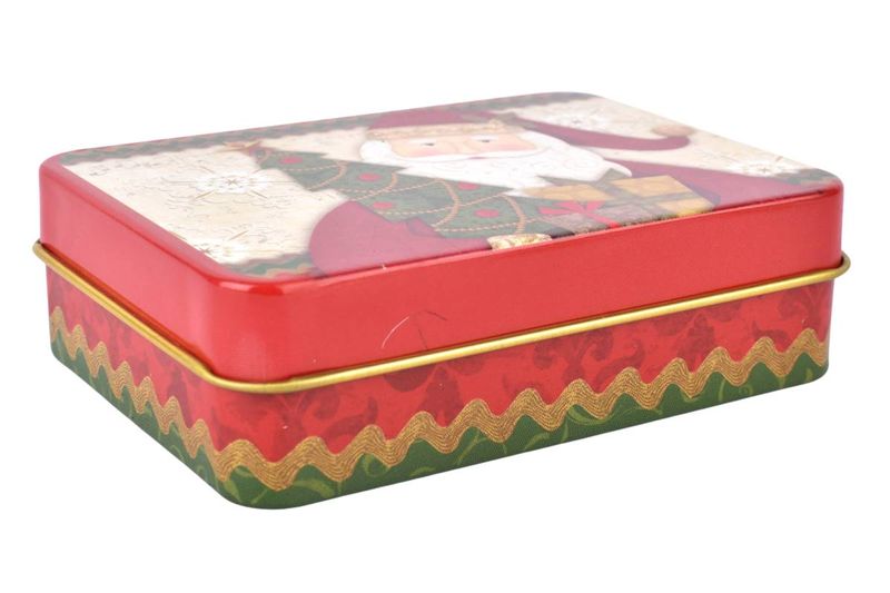Lata navideña decorativa 9×6.5×2.8 cm con diseños festivos. Ideal para regalos o dulces. ¡Viví la magia de la Navidad con Ferniplast.com!