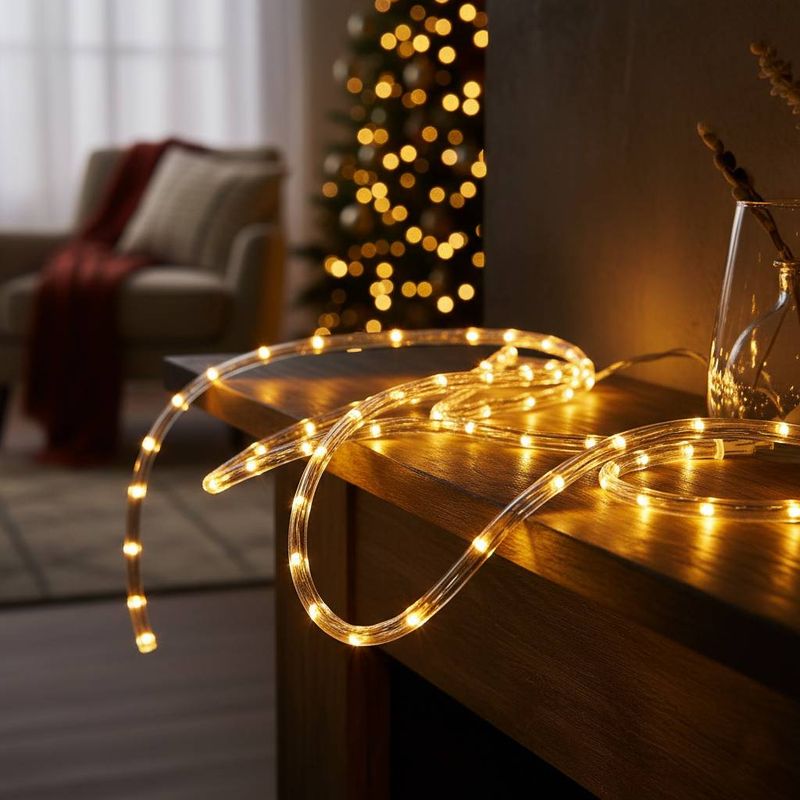 Manguera luminosa multicolor de 5 m con 8 funciones y 50 LED para decorar interiores y exteriores. Iluminá tus espacios. Cómprala en Ferniplast.com. Perfecta para resaltar ventanas, muebles, escaleras, galerías y árboles navideños con una iluminación cálida y envolvente.