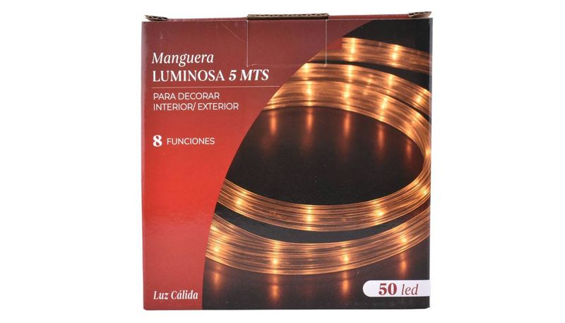 Manguera luminosa cálida de 5 m con 50 LED y 8 funciones. Ideal para decorar interiores y exteriores. Ilumina tus espacios hoy. Cómprala en Ferniplast.com.