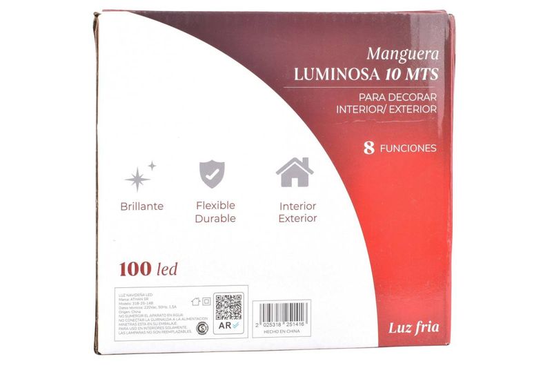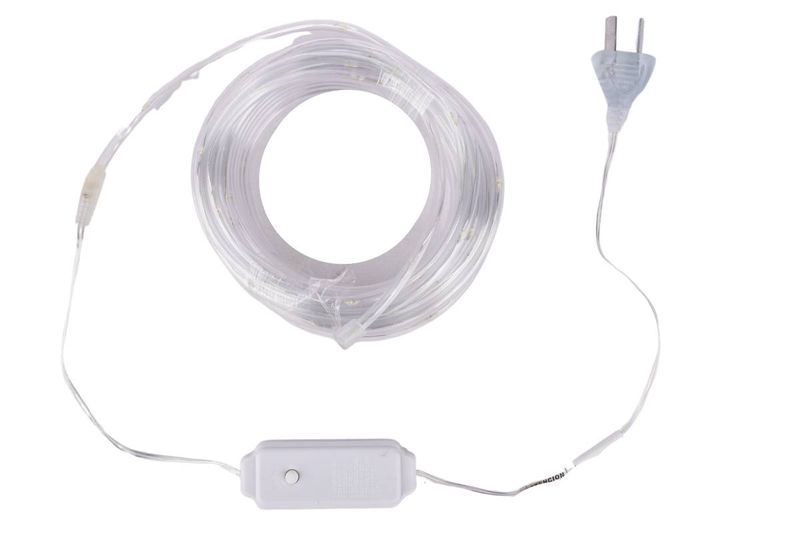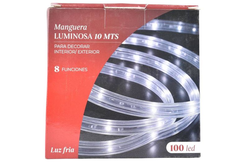 Manguera luminosa LED de 10 metros con luz fría y 8 efectos, ideal para decorar ambientes interiores y exteriores. Perfecta para iluminar ventanas, galerías, frentes, balcones, árboles o espacios festivos. Su diseño flexible permite adaptarla a cualquier forma o superficie.