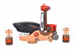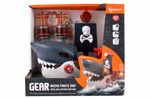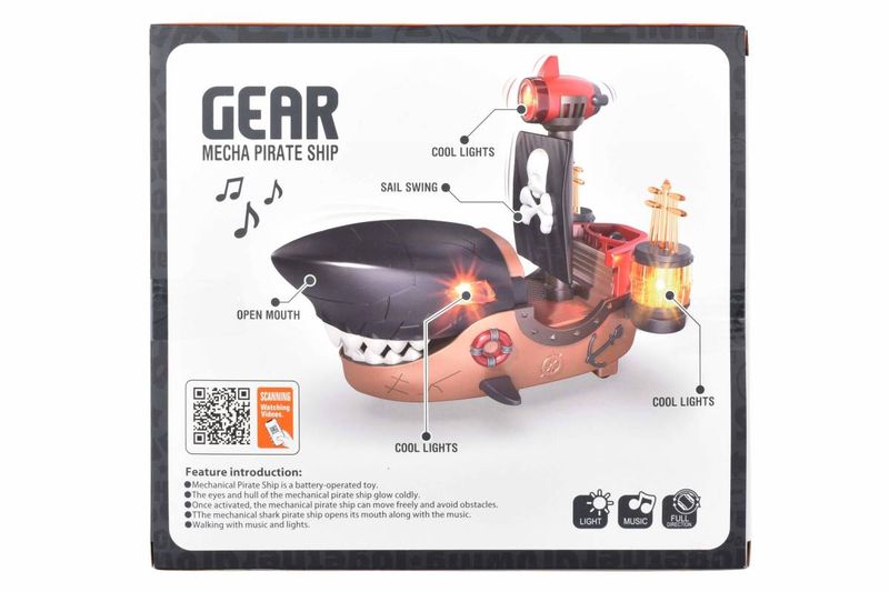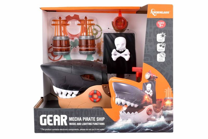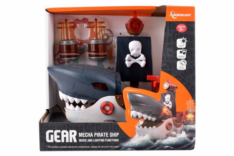 Barco pirata de juguete con diseño de tiburón mecánico, pensado para el juego activo y la imaginación infantil. Incorpora efectos de luz y música que se activan durante el funcionamiento, junto con movimiento automático. Su estética llamativa y partes móviles lo hacen ideal para recrear aventuras piratas de forma dinámica y entretenida.