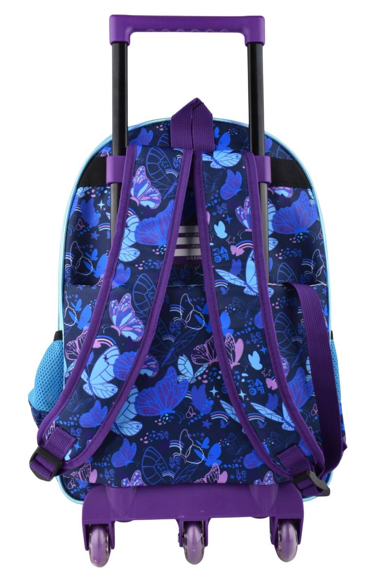 Mochila escolar con carro y diseño de mariposa, ideal para transportar útiles con mayor comodidad y estilo en el día a día. Ideal para el uso escolar diario, permitiendo llevar libros y útiles de forma organizada y reduciendo el peso en la espalda gracias al sistema con carro.