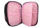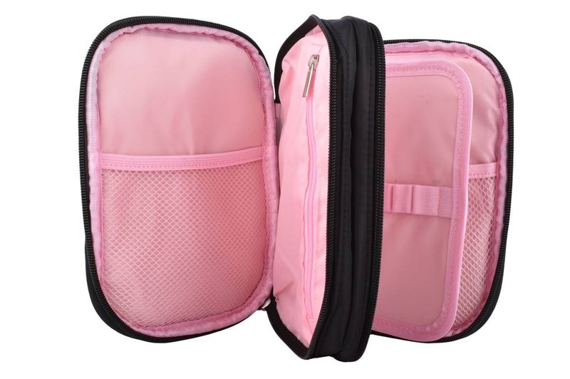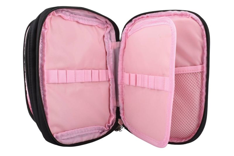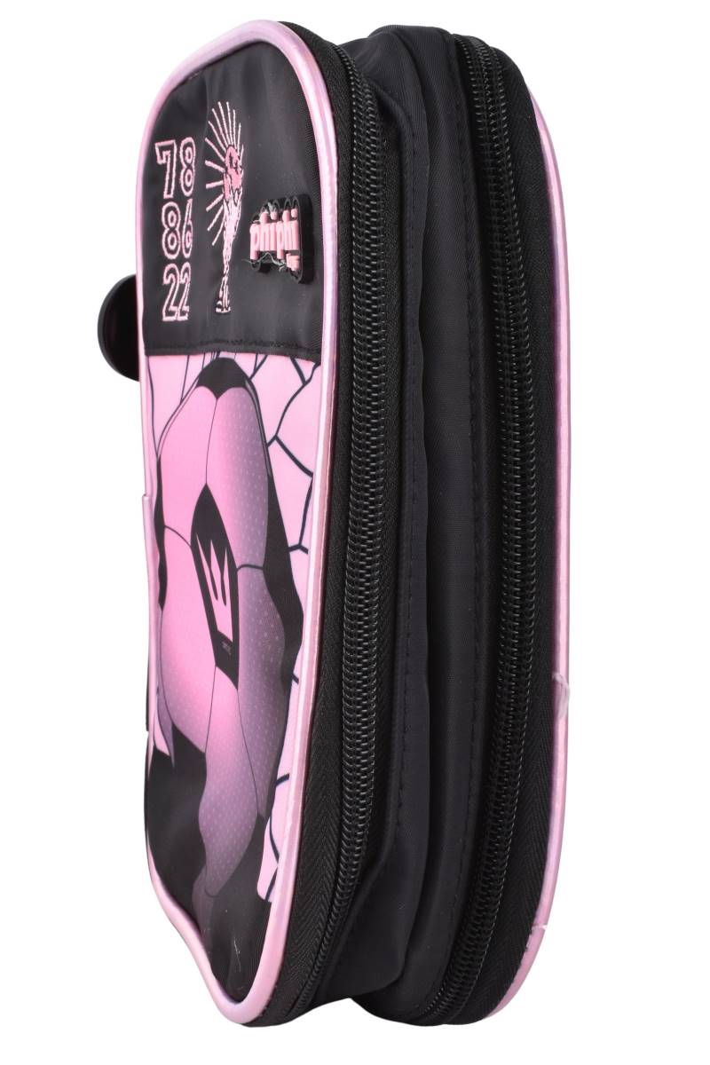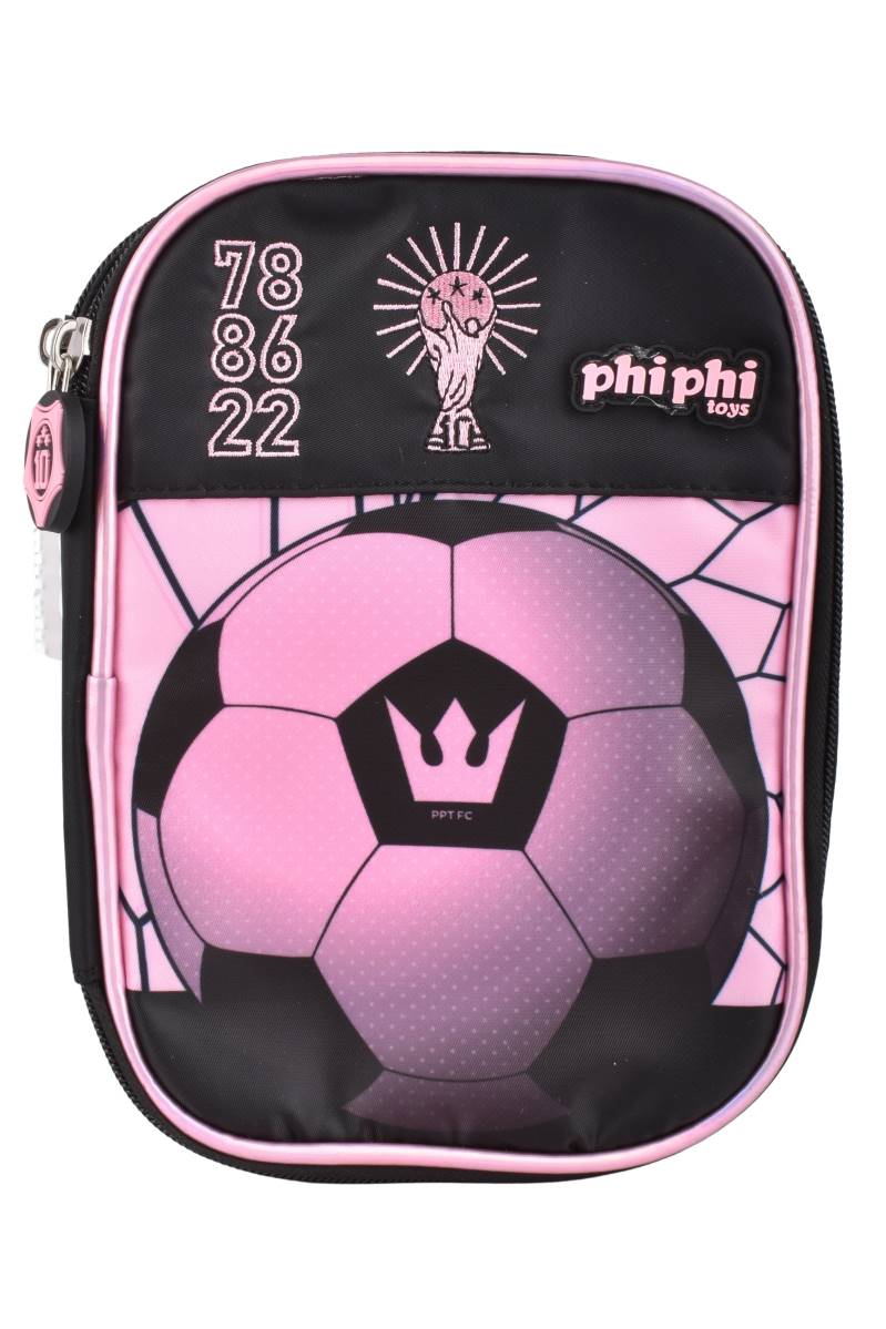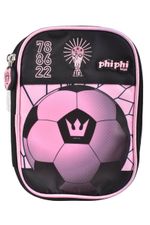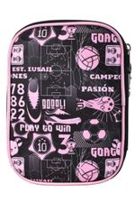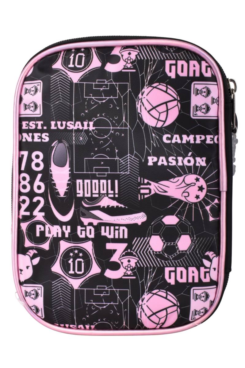Cartuchera escolar con diseño de fútbol en tonos rosa y negro, ideal para organizar útiles de forma práctica y segura en el día a día.