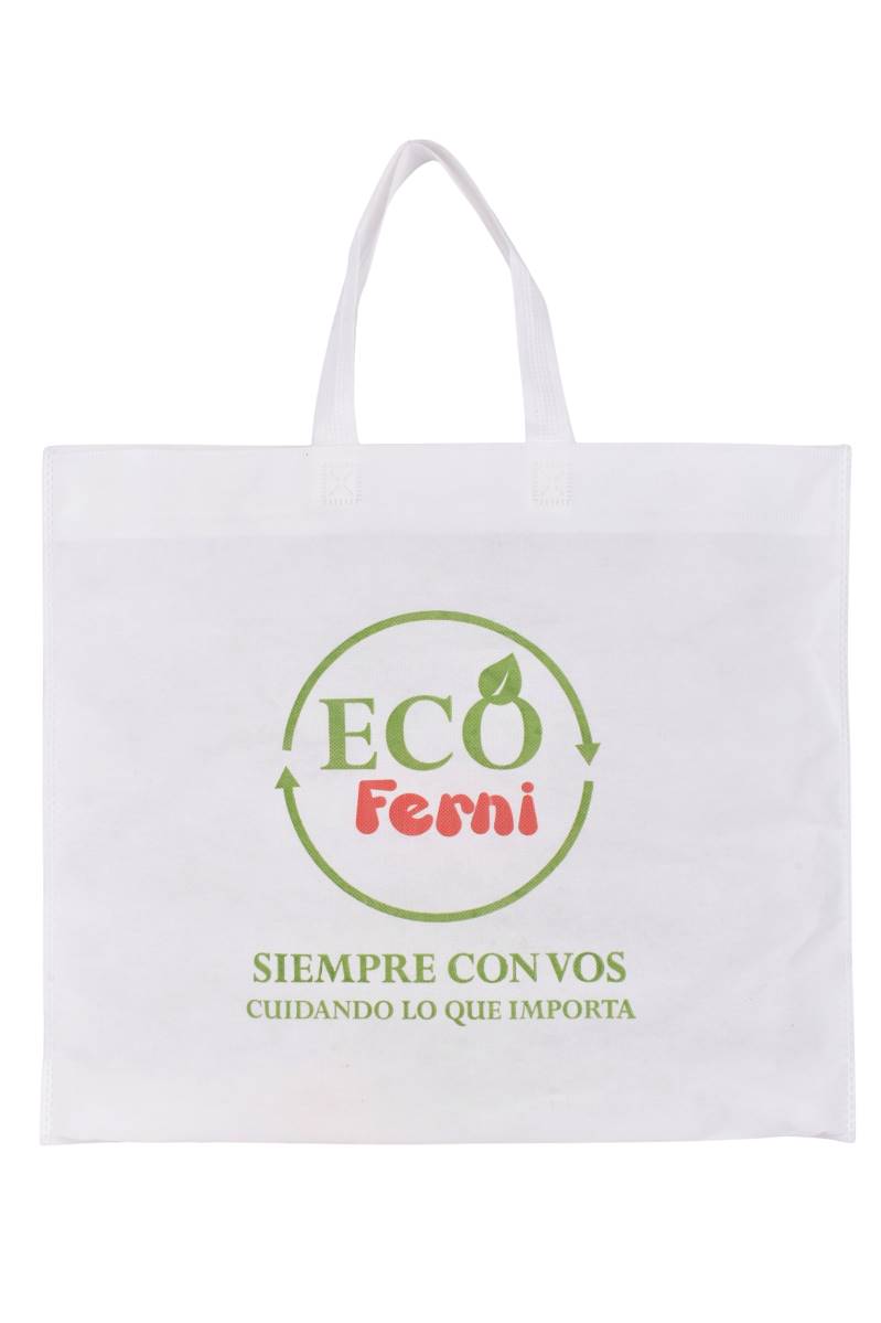 Bolsa reutilizable de friselina Ferni Eco, diseñada para transportar compras y objetos personales de forma práctica y responsable. Su formato amplio con base permite mayor capacidad, siendo una alternativa funcional para el uso diario en supermercados, ferias o comercios, reduciendo el uso de bolsas descartables.