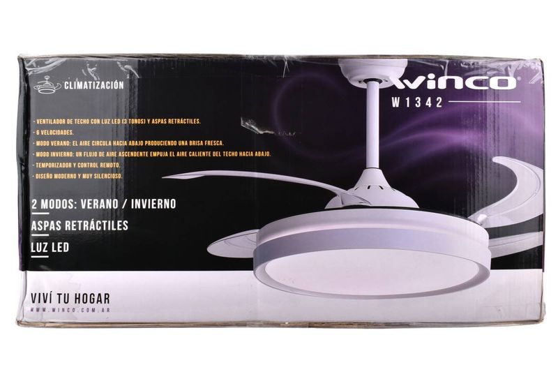 Ventilador de techo Winco W1342 con luz LED, aspas retráctiles y control remoto. 6 velocidades, modo verano/invierno y diseño moderno. Cómpralo aquí en Ferniplast.com