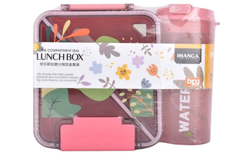Lunchera con divisiones, cubierto y vaso con tapa en set de 3 piezas. Práctica y reutilizable para llevar comidas. Cómprala en Ferniplast.com.