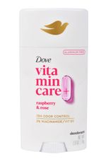 Desodorante en barra Dove Vitamin Care Raspberry & Rose, formulado para el control del olor diario mientras cuida la piel, con una fragancia suave y fresca inspirada en frambuesa y rosa.