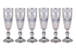 Set de 6 copas angostas de vidrio gris con diseño de líneas y círculos, elegantes y resistentes para brindar en ocasiones especiales. Perfectas para servir champagne, espumantes y tragos en celebraciones, cenas y eventos especiales, aportando un estilo sofisticado a la mesa.