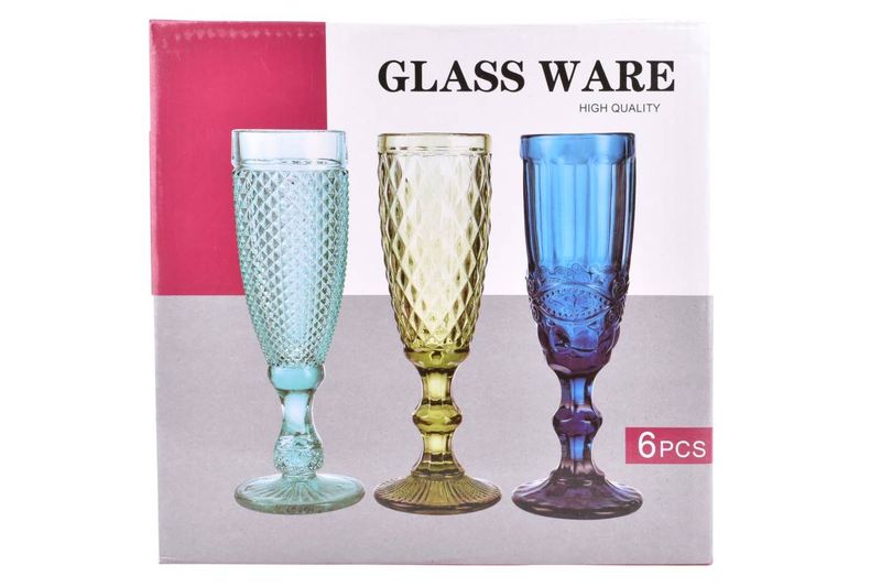 Set de 6 copas angostas de vidrio gris con diseño de líneas y círculos. Elegantes, resistentes y perfectas para champagne y eventos especiales. Ideal para tu mesa. Comprá en Ferniplast.com
