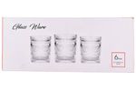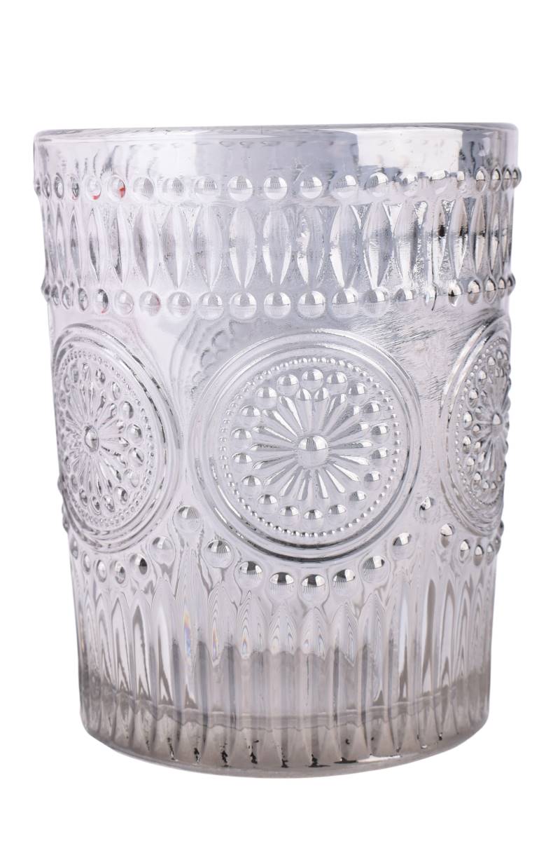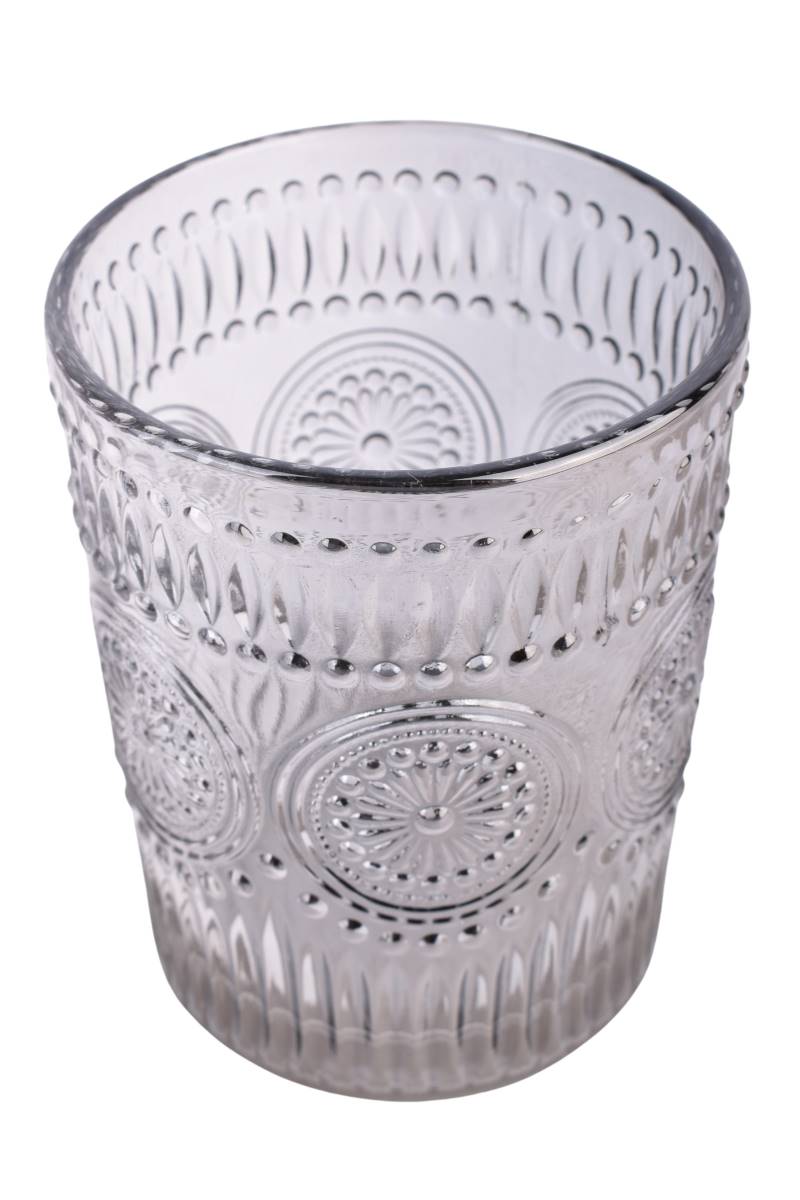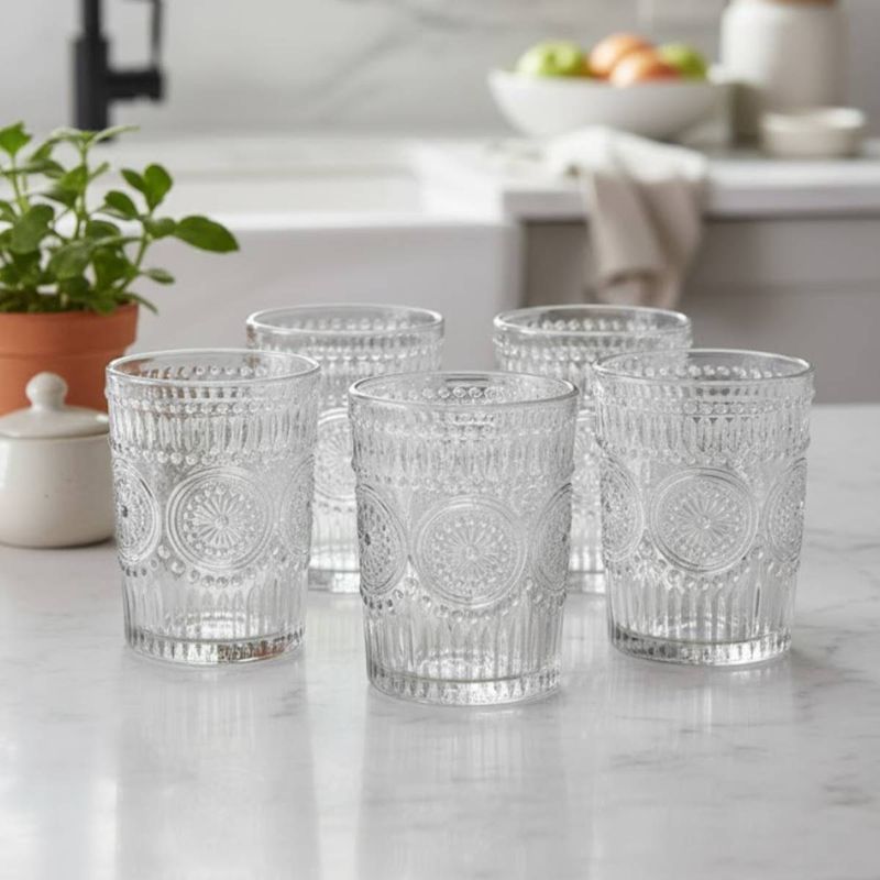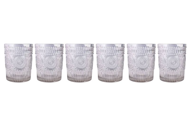 Set de 6 vasos de vidrio con diseño en relieve de líneas y círculos, ideales para bebidas frías y una mesa con estilo clásico. Perfectos para servir agua, jugos, gaseosas o tragos en el día a día o en reuniones especiales.