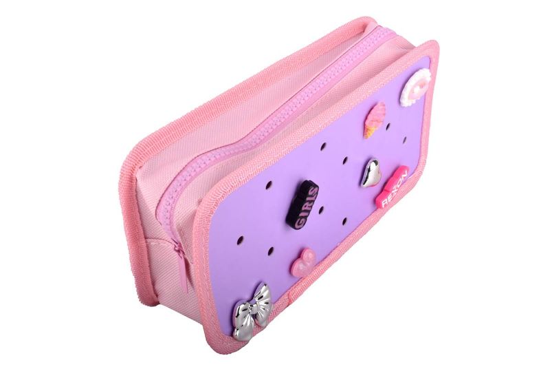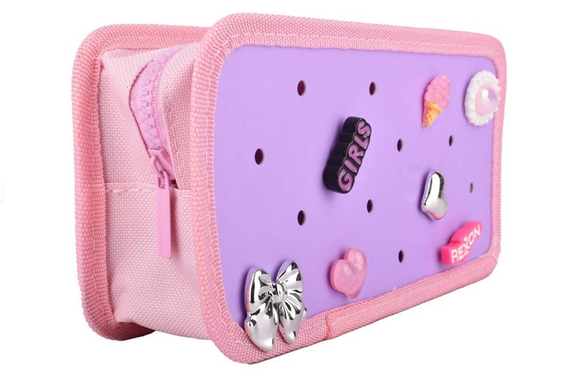 Cartuchera Rexon diseñada para organizar útiles escolares de uso diario, combinando practicidad y estilo. Cuenta con un panel frontal con pines decorativos intercambiables que permiten personalizarla fácilmente. Ideal para lápices, fibras, lapiceras y pequeños accesorios, es una opción funcional para la escuela o actividades creativas.