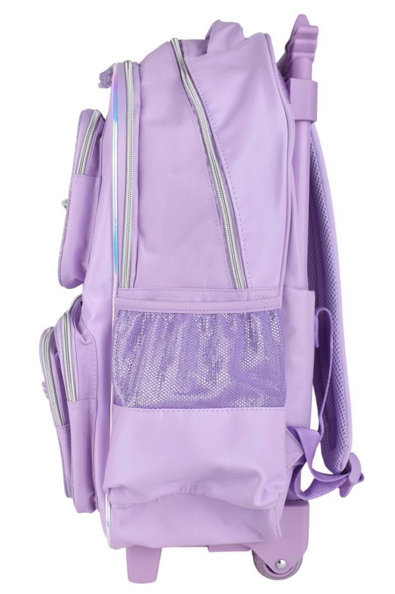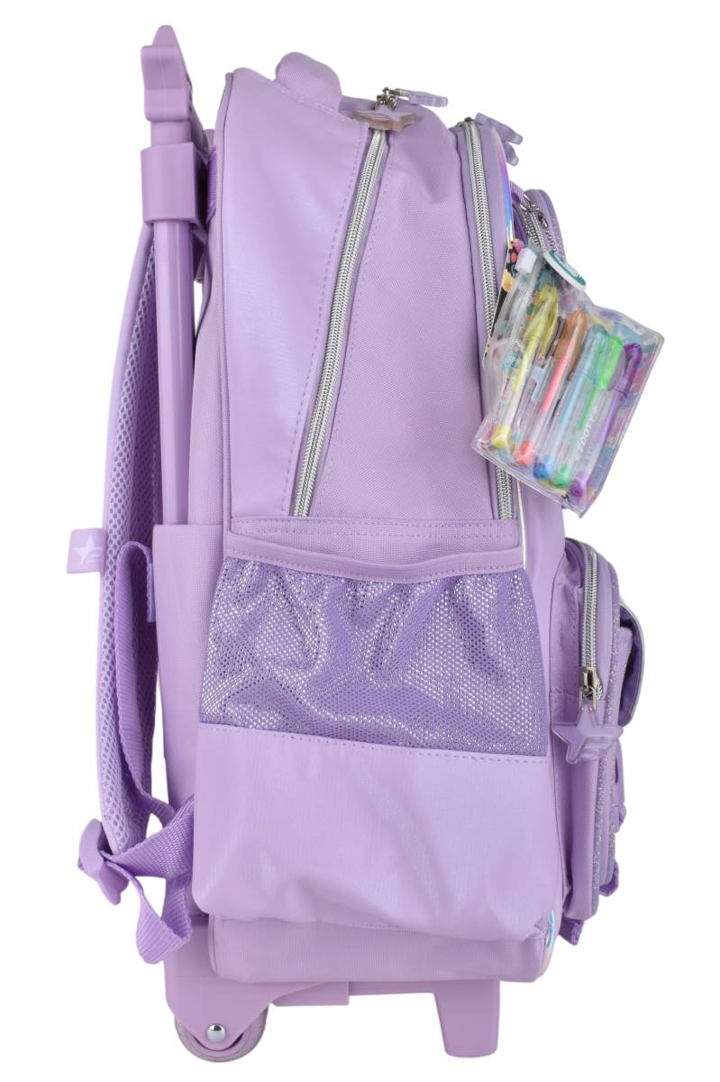 Mochila con carro Footy Glow Fly 18" ideal para el uso escolar diario. Su formato con ruedas y manija extensible facilita el traslado de libros y cuadernos, mientras que sus múltiples compartimentos permiten organizar útiles y accesorios de forma práctica y cómoda.