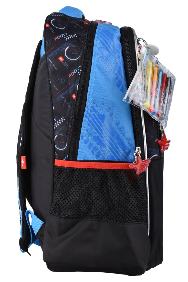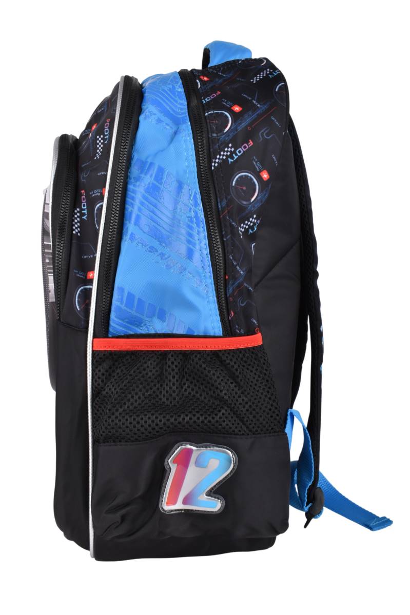 La mochila Footy 18" F1 Race combina diseño deportivo con gran capacidad para el uso escolar diario. Cuenta con compartimentos amplios y bolsillos laterales de red que permiten organizar útiles, carpetas y botella de forma práctica, brindando comodidad gracias a sus tiras acolchadas y ajustables.