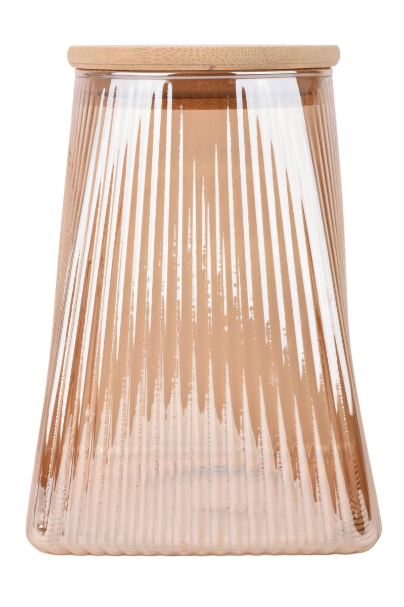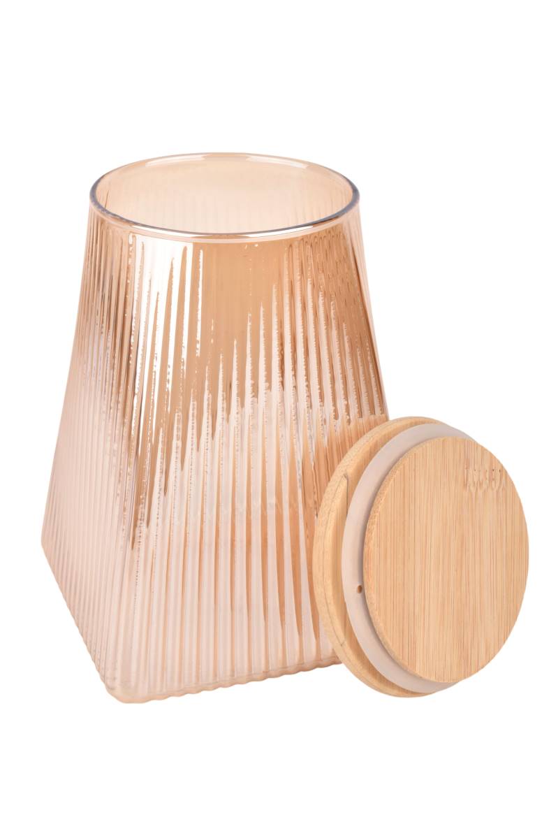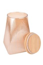 Frasco de vidrio rayado con capacidad de 950 ml, ideal para almacenar alimentos secos como cereales, legumbres, azúcar o frutos secos. Su tapa de madera aporta un cierre firme y un detalle natural que combina funcionalidad y diseño, perfecto para mantener la cocina organizada y con estilo.