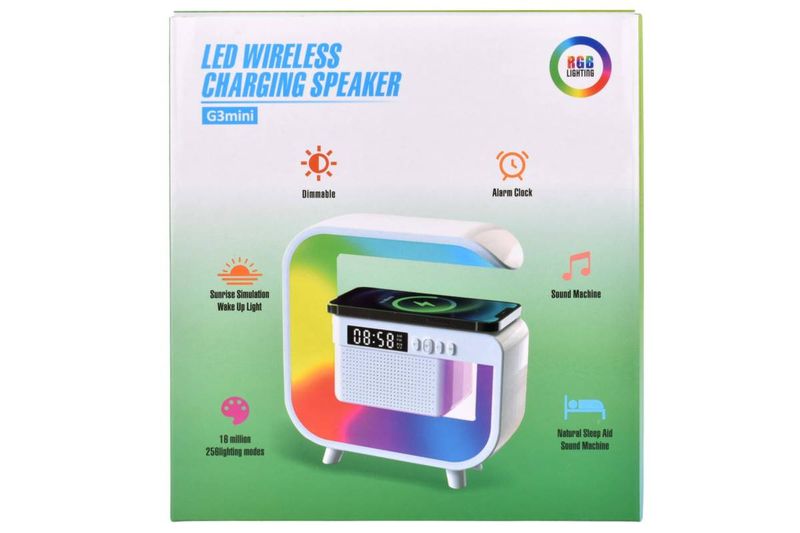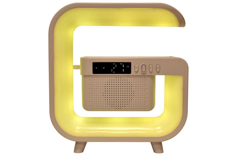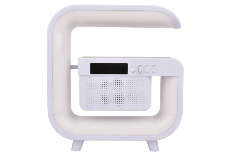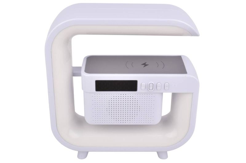 Luz LED RGB con parlante y carga inalámbrica Qi. Ideal para dormitorio u oficina. Música, alarma y color en uno. Cómpralo en Ferniplast.com