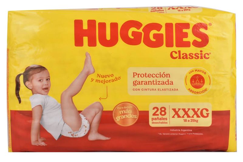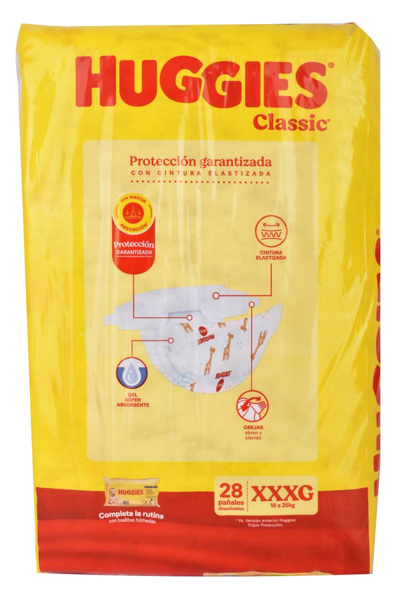 Pañales Huggies Classic jumbo talle XXXG x28 unidades, ideales para bebés de 18 a 25 kg. Protección diaria y buen ajuste. Cómpralo en Ferniplast.com