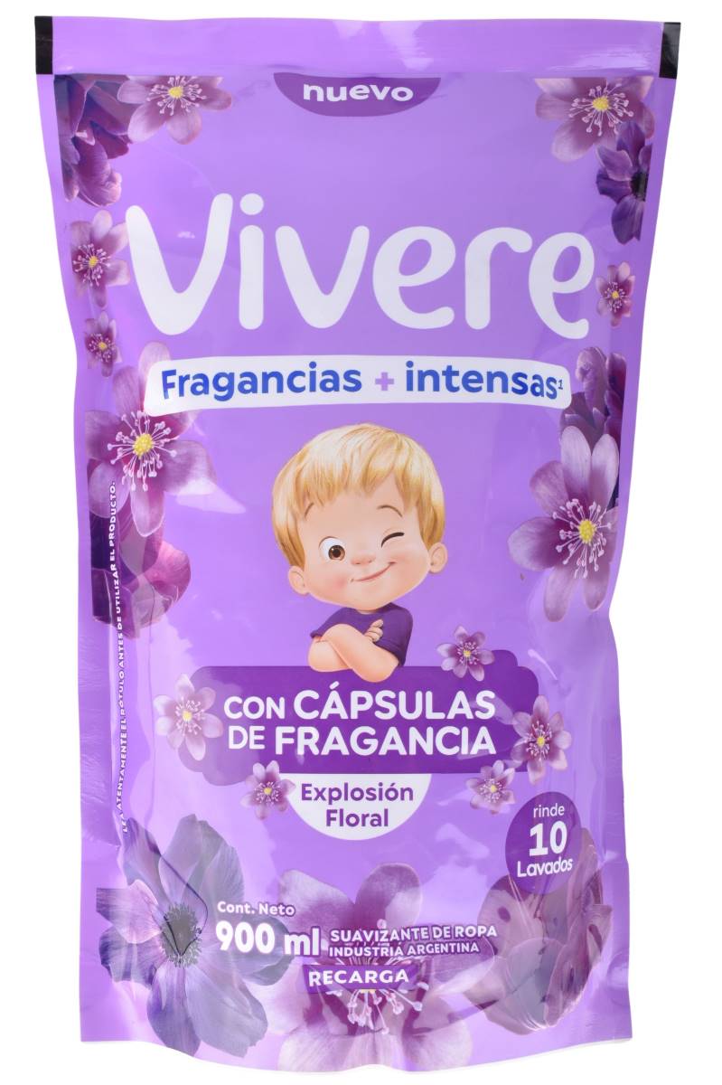 Suavizante Vivere Explosión Floral + Intenso 900 ml con cápsulas de fragancia. Rinde hasta 10 lavados en formato recarga. Cómpralo en Ferniplast.com