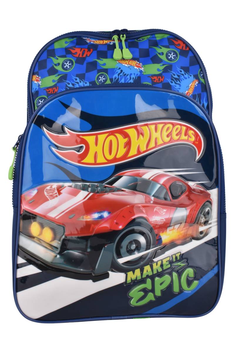 Mochila escolar de espalda Hot Wheels Epic de 16", diseñada para el uso diario en primaria. Cuenta con un amplio compartimento principal y bolsillo frontal para una organización práctica de útiles, cuadernos y carpetas. Su diseño liviano y estampado oficial Hot Wheels la hace ideal para acompañar la rutina escolar con comodidad y estilo.