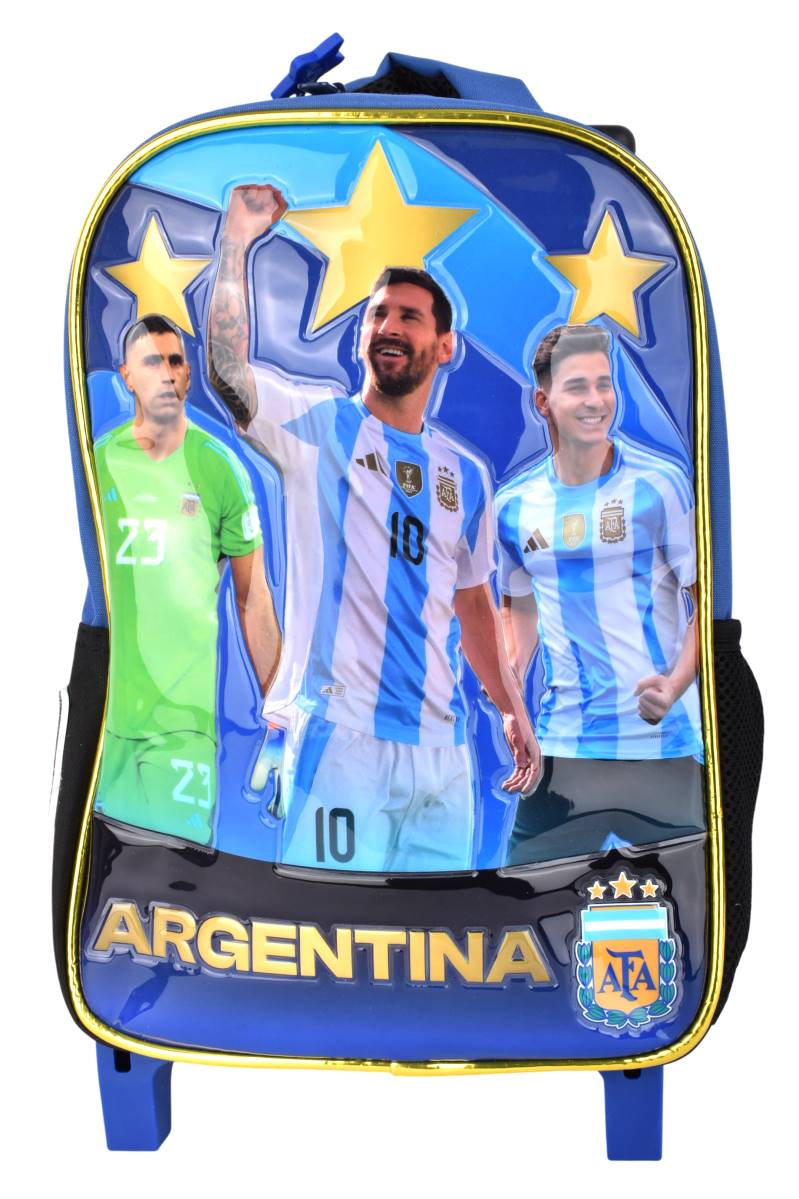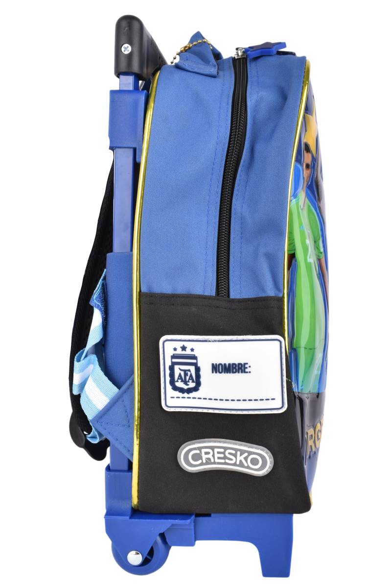 Mochila con carro Cresko AFA 12" ideal para jardín y primeros años de primaria. Su sistema con ruedas y manija extensible facilita el traslado diario, mientras que el frente rígido con diseño oficial AFA brinda mayor protección y un look deportivo que acompaña cada jornada escolar.
