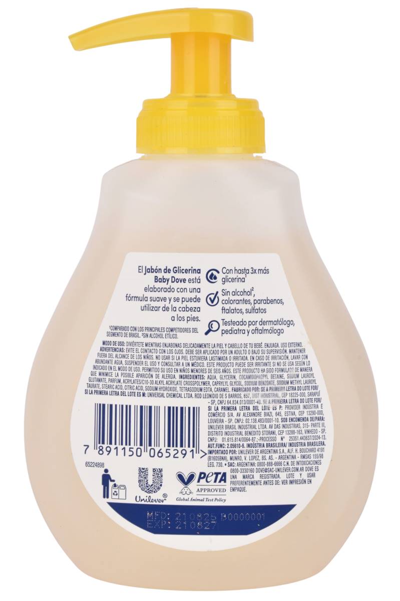 Jabón líquido Baby Dove con glicerina, formulado para la limpieza diaria de la piel del bebé. Su uso de la cabeza a los pies ayuda a limpiar suavemente sin resecar, manteniendo la piel cuidada durante el baño. Apto para la rutina diaria, con una textura suave y fácil de enjuagar.