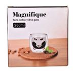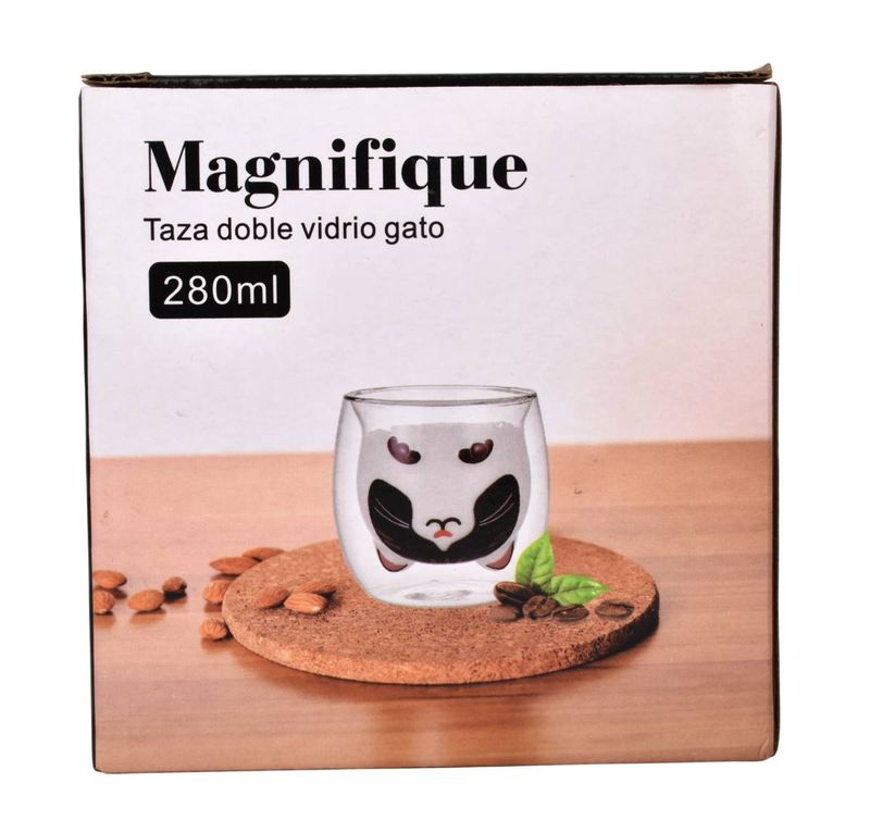 Taza de doble vidrio con diseño de gato, ideal para disfrutar café, té o infusiones con un estilo original. Su capacidad de 280 ml la hace práctica para el uso diario. El doble vidrio genera un atractivo efecto visual y ayuda a conservar la temperatura de la bebida por más tiempo.