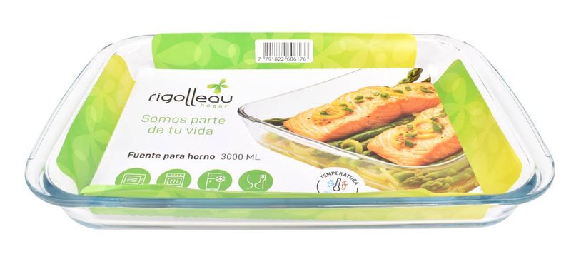 Fuente rectangular Rigolleau de 3000 ml, ideal para preparar y servir comidas al horno. Su diseño en vidrio permite una cocción uniforme y presentación directa en la mesa. Apta para horno y heladera, es práctica para uso diario en preparaciones familiares.