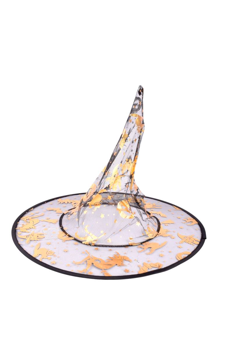 Sombrero de Bruja con Diseño de Telaraña y Estrellas. Ideal para disfraces de Halloween o fiestas temáticas.