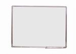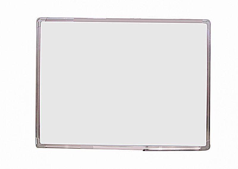 Pizarra doble faz blanca, recubierta de aluminio con bordes redondeados y recubiertos de plástico, sus medidas son 70cm por 100cm.