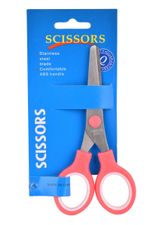 Tijera de 13.50 cm con hojas de acero inoxidable y punta fina, ideal para trabajos de precisión en la escuela o manualidades que requieren cortes detallados.