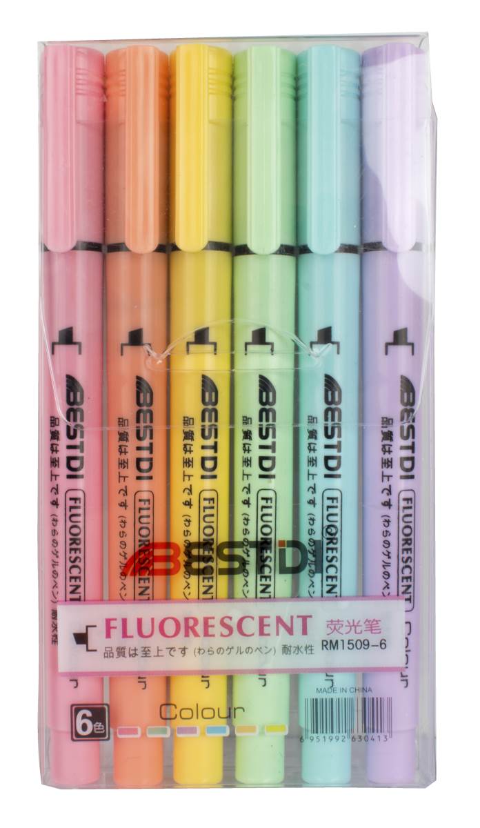 Set de resaltadores por seis unidades color pastel con punta biselada, tinta permanente.