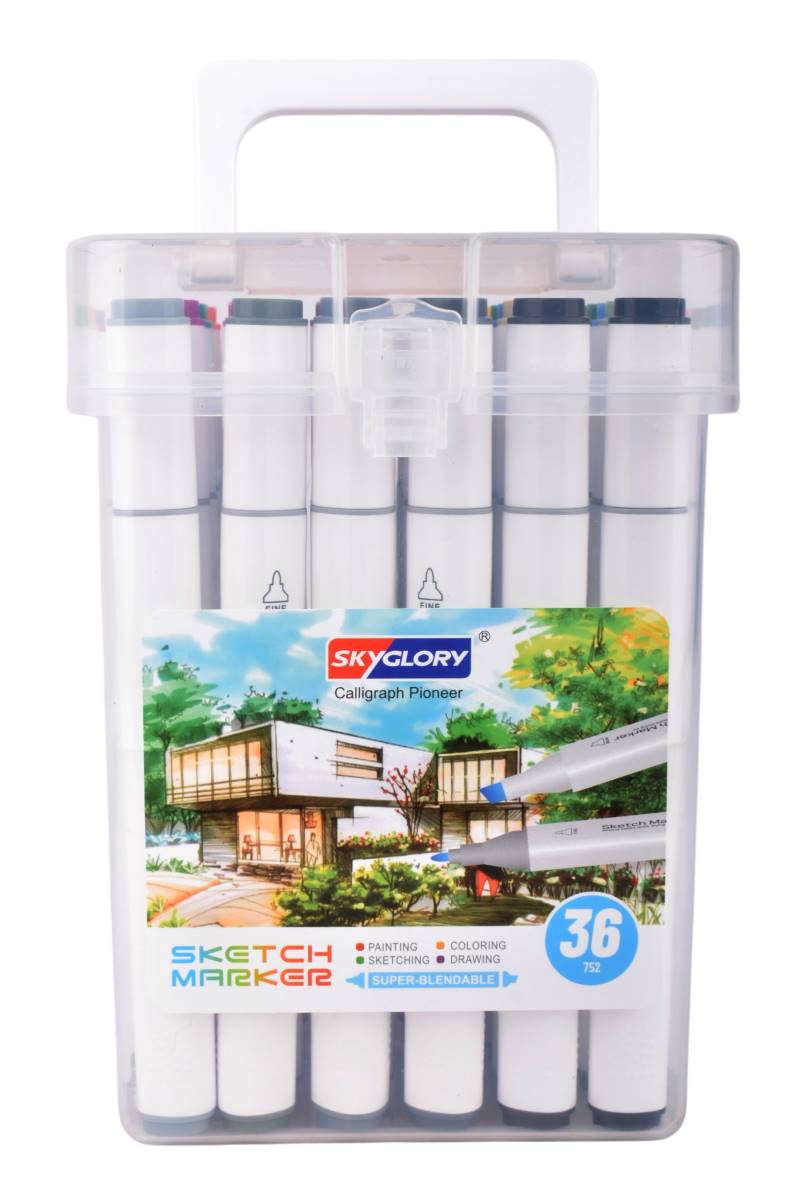 Marcadores doble punta. Presenta un diseño de doble cabezal. Su tinta es a base de alcohol lo que permite escribir y pintar en superficies lisas, siendo difícil que se corra con el agua. Colores brillantes y ultra pigmentados