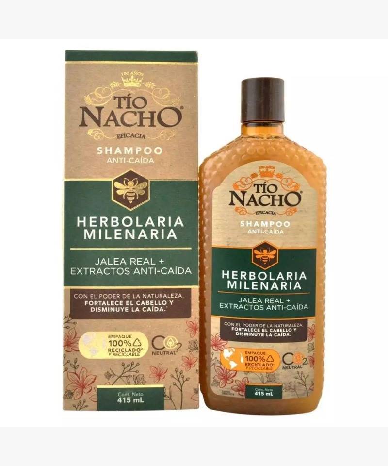 Shampoo Tío Nacho Herbolaria Milenaria. Formulado con jalea real, ortiga y extractos anti caída de origen natural. Ayuda a nutrir y fortalecer tu cabello hebra por hebra y de raíz a puntas.