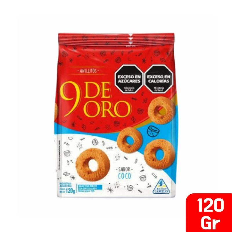 Galletas 9 de Oro sabor Coco por 120 gramos. En forma de anillitos con Coco rallado. Perfectas para acompañarte en tus desayunos y meriendas