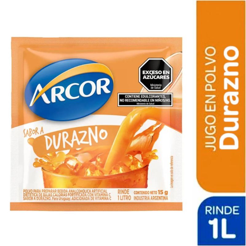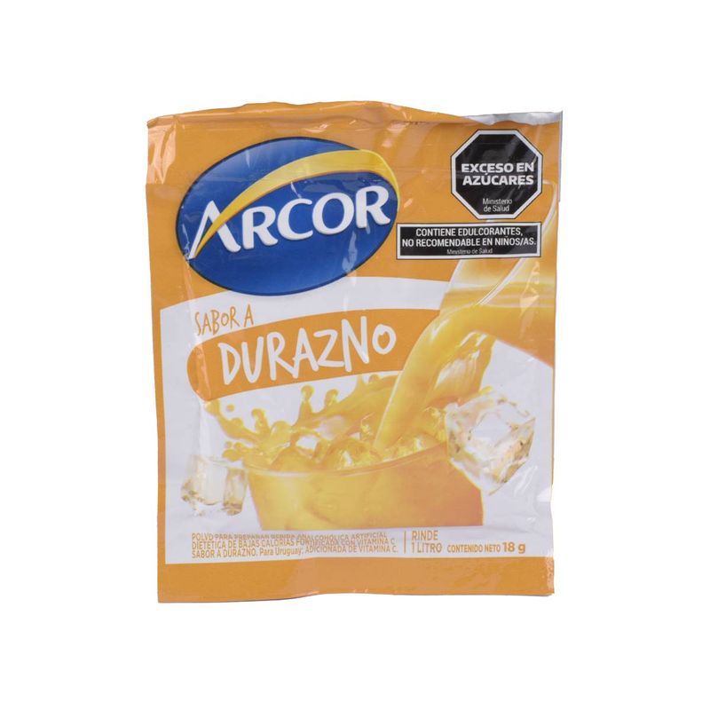 Jugo en polvo para preparar, Arcor sabor naranja durazno. Fuente de vitaminas C, bajo en azucares presentada en su envase de 18g.
