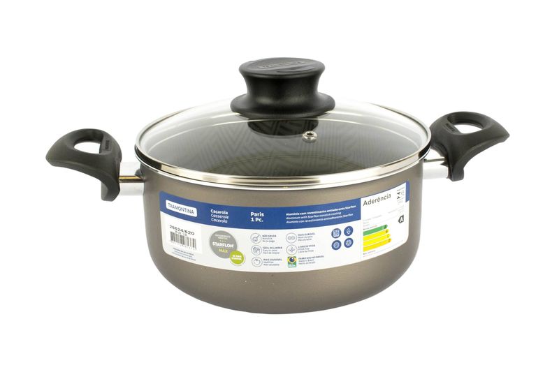 Cacerola Tramontina Paris Texture. Perfecta para el uso diario ya que está fabricada en Aluminio de 1,8 milímetros de espesor y cuenta con revestimiento antiadherente Starflon Max; dos características que proporcionan una cocción rápida y uniforme de los alimentos evitando que se peguen en la superficie y facilitando la limpieza.