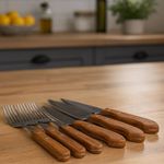 Set Tramontina de 12 cubiertos con mangos de madera tratada y acero inoxidable, ideal para asados, cenas y uso diario. Perfecto para acompañar parrilladas, comidas al aire libre y mesas familiares, ofreciendo un corte preciso y una presentación elegante.