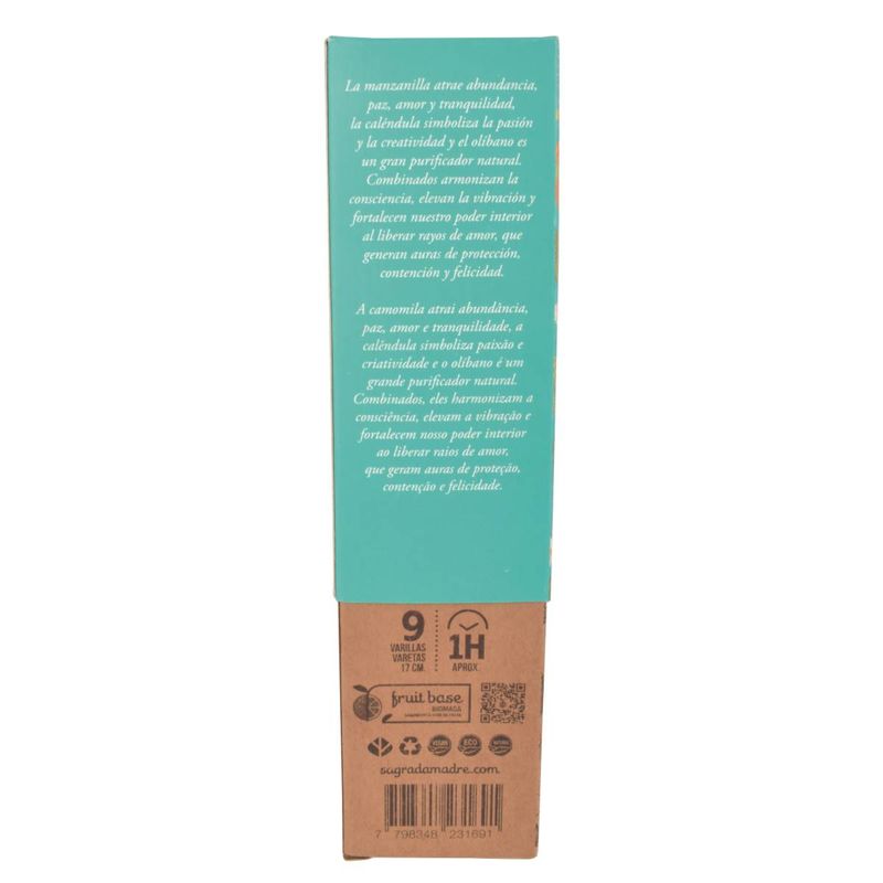 Disfruta de la calma y la purificación con el incienso de Caléndula, Manzanilla y Olíbano de Sagrada Madre. Hecho con ingredientes naturales, este incienso es ideal para relajarte y purificar tu hogar.