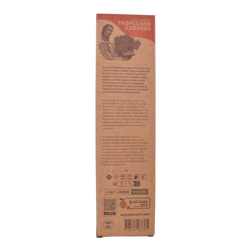 Sahumerio en varilla "Tropicana Cookies" de Sagrada Madre, elaborado artesanalmente con terpenos naturales. Su aroma dulce y tropical, con notas de galleta, te transportará a un ambiente relajante y energizante. Ideal para crear un ambiente agradable y lleno de vitalidad en tu hogar o espacio de trabajo.