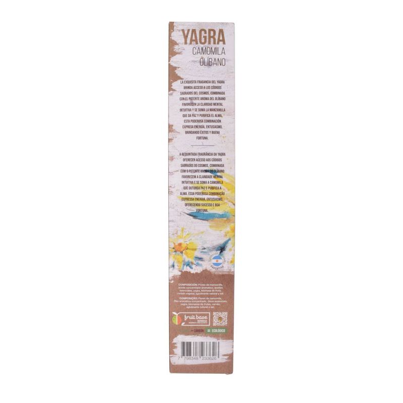 Sahumerios de Yagra, Camomila y Olíbano, ideales para crear un ambiente de claridad mental, paz interior y éxito en tu hogar. Su combinación de aromas herbales y resinosos te ayudará a relajarte, meditar y conectar con tus emociones más positivas.