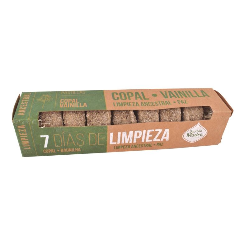 Pastillas de copal y vainilla de Sagrada Madre, ideales para realizar una limpieza ancestral y crear un ambiente de paz interior en tu hogar. Su combinación de aromas dulces y terrosos te ayudará a relajarte, meditar y conectar con tu interior.
