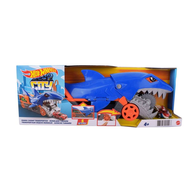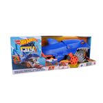 Camión Hot Wheels City con remolque tiburón, ideal para transportar autos y crear aventuras llenas de acción. Juego creativo para niños. Cómpralo en Ferniplast.com