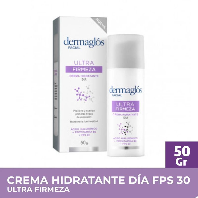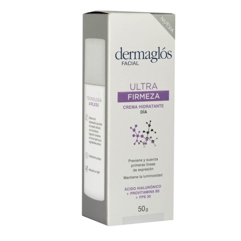 Crema Dermaglós Ultra firmeza. Formulada para hidratar, prevenir y suavizar las primeras líneas de expresión. Además disminuye la pérdida de ácido hialurónico y protege con FPS30.