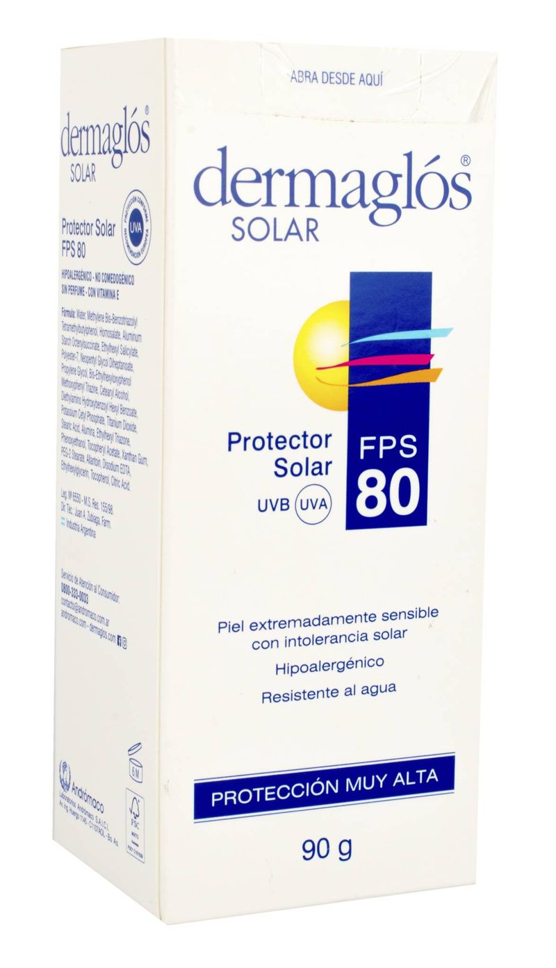 Crema solar Dermaglós. Está formulado para brindar la hidratación y nutrición necesaria para pieles sensibles. Protege de las quemaduras y previene el envejecimiento prematuro producido por los rayos solares UVA/UVB.
