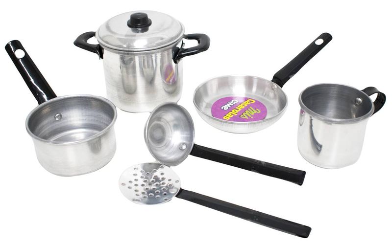 Batería de cocina de metal. ¡Vamos a jugar y divertirnos en la cocina! Incluye 7 piezas: 1 cucharon, 1 espumadera, 1 hervidor, 1 sartén y 2 ollas. Ideales para desafiar tus habilidades e imaginación